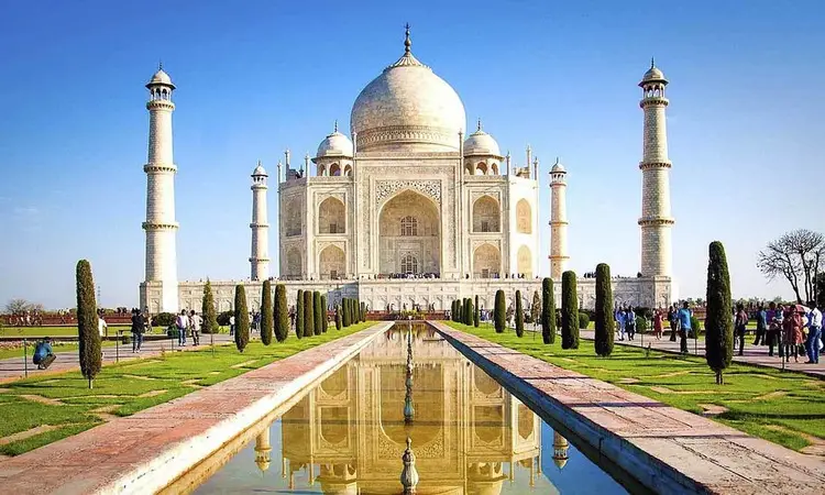 Đây là một trong bảy kì quan của thế giới, đền Taj Mahal là kiến trúc Mughal bằng đá cẩm thạch trắng, được xây dựng bởi hoàng đế Shah Jahan để tưởng nhớ vợ ông, Mumtaj Mahal, nằm trên bờ sông Yamuna ở Agra và được hoàn thành vào năm 1653 với chi phí ước tính là 32 triệu rupee Ấn Độ, ngày nay tương đương với 58 tỷ rupee Ấn Độ. Nó được coi là ví dụ điển hình nhất của kiến trúc Mughal trên toàn thế giới và được gọi là “Viên ngọc của nghệ thuật Hồi giáo ở Ấn Độ”. Đây có lẽ là di tích được thế giới công nhận nhiều nhất vì sự liên kết của nó với các di sản của Ấn Độ.